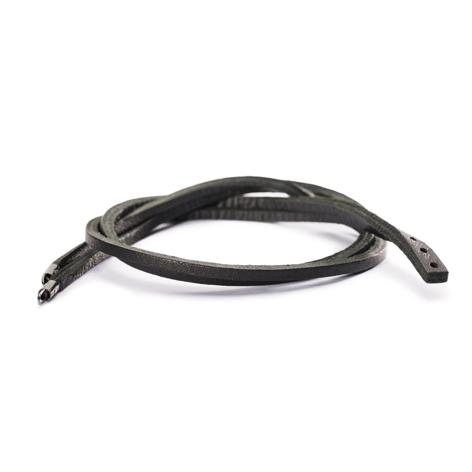 The double leather bracelet is available in three sizes. The bracelet is wrapped around the wrist twice.