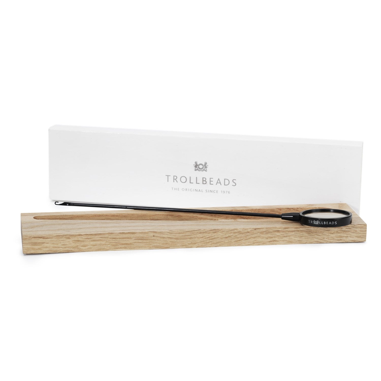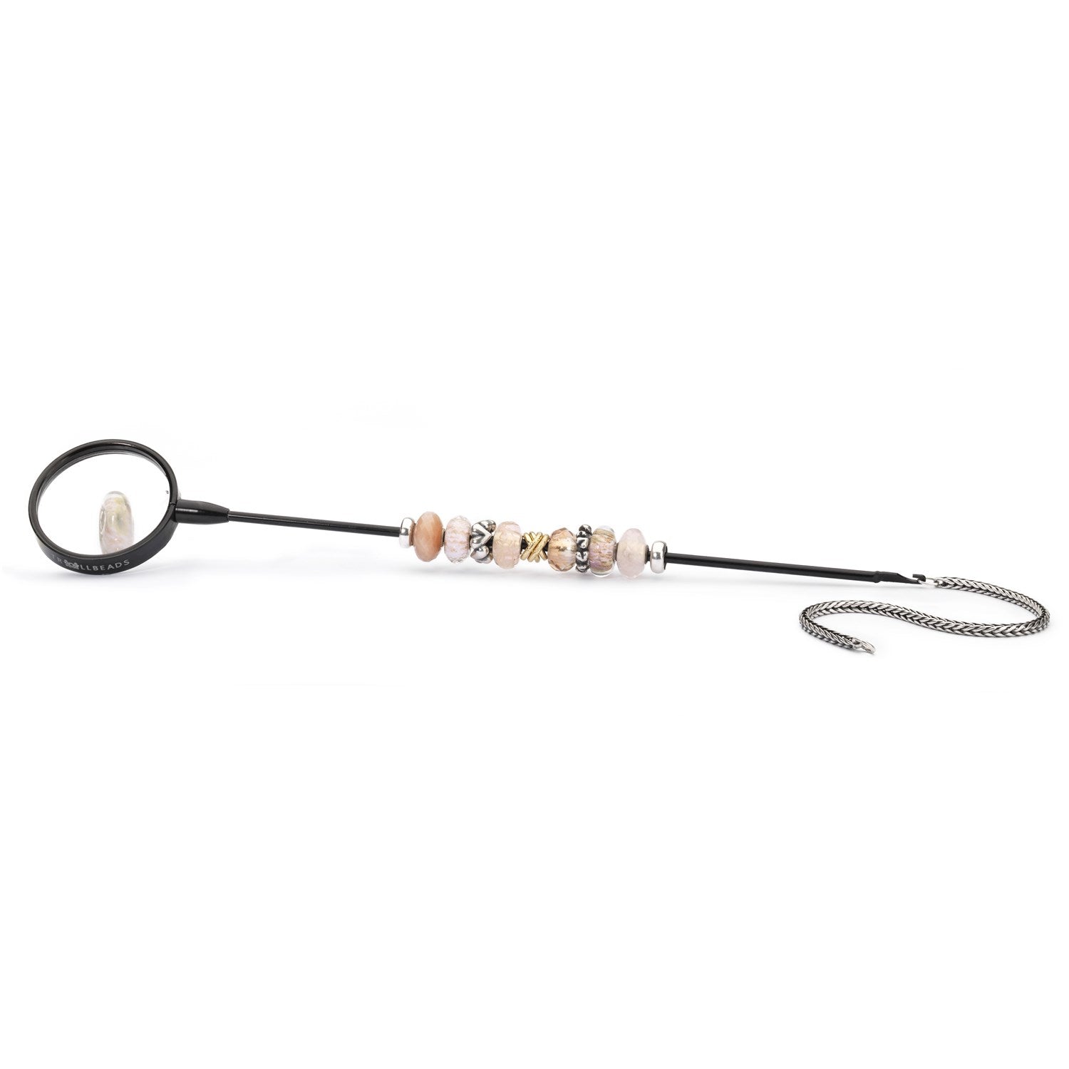 The Bead Stringer will help you design your personal bracelet. This beautiful steel jewellery accessory has a magnifying glass at the end so you can view your beads in detail. A wood box is included with each Bead Stringer.